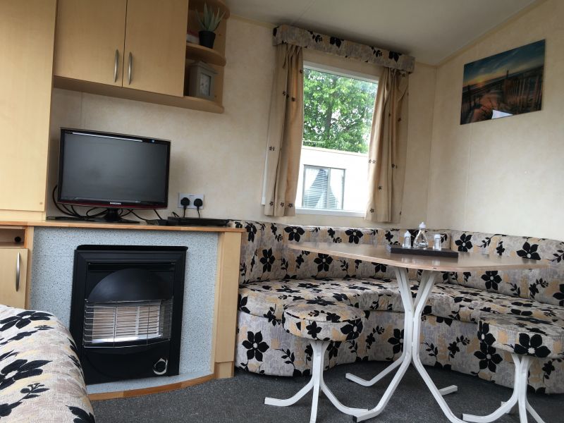 Lounge gas fire, double sofa bed and dining area.